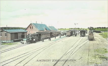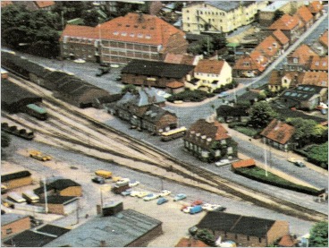 The top picture shows picture shows Aakirkeby Station, in the centre of the island. The bottom shows the station in Ronne, the largest town, from the air sometime before the railway closed in 1968.